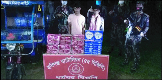 মাধবপুর প্রতিনিধি ॥ মাধবপুরে ভারতীয় চোরাই পণ্যসহ দুইজনকে আটক করেছে বর্ডারগার্ড বাংলাদেশ বিজিবি। বৃহস্পতিবার রাত ৮ টার দিকে উপজেলার ১৯৯৭/৭ এর পিলারের সস্তামোড়া এলাকায় গোপন সংবাদের ভিত্তিতে অভিযান চালিয়ে টমটম অটোরিক্সাসহ তাদেরকে আটক করা হয়। আটককৃতরা হল, মাধবপুর উপজেলার সস্তামোড়া গ্রামের চান্দ আলীর পুত্র মন্নর আলী (২৭) ও একই এলাকার বিল্লাল মিয়ার পুত্র হৃদয় মিয়া (২০)। বিজিবি ৫৫ ব্যাটালিয়নের অধিনায়ক এসএনএম সামিউন্নবী চৌধুরী জানান, বিজিবির নায়েক হামিদুল ইসলামের নেতৃত্বে অভিযান চালিয়ে ওই এলাকা থেকে দুই চোরাকারবারীসহ বেশ কিছু ভারতীয় পণ্য জব্দ করা হয়। এর মধ্যে রয়েছে, ২২১ পিস ভারতীয় লেকটোজেন, ৭২০ পিস ভারতীয় নেহার মেহেদী। যার বাজার মূল্য প্রায় ১ লাখ ৪৩ হাজার টাকা। তিনি আরো জানান, আটককৃতদের বিরুদ্ধে আইনী পক্রিয়া শেষে মাধবপুর থানায় হস্তান্তর করা হবে।
